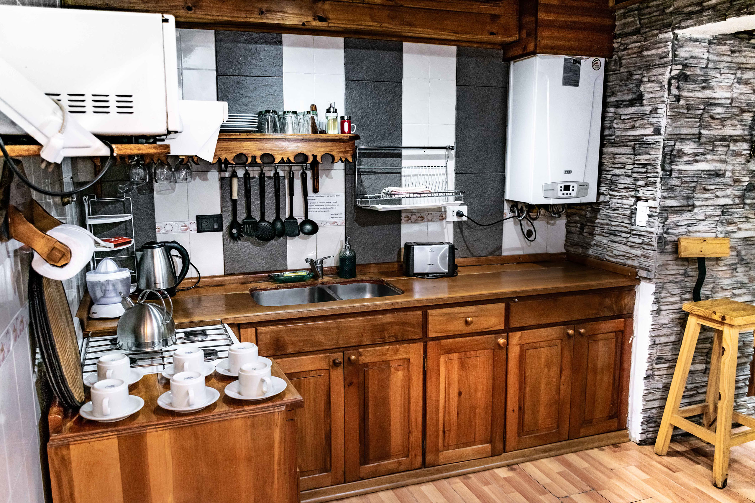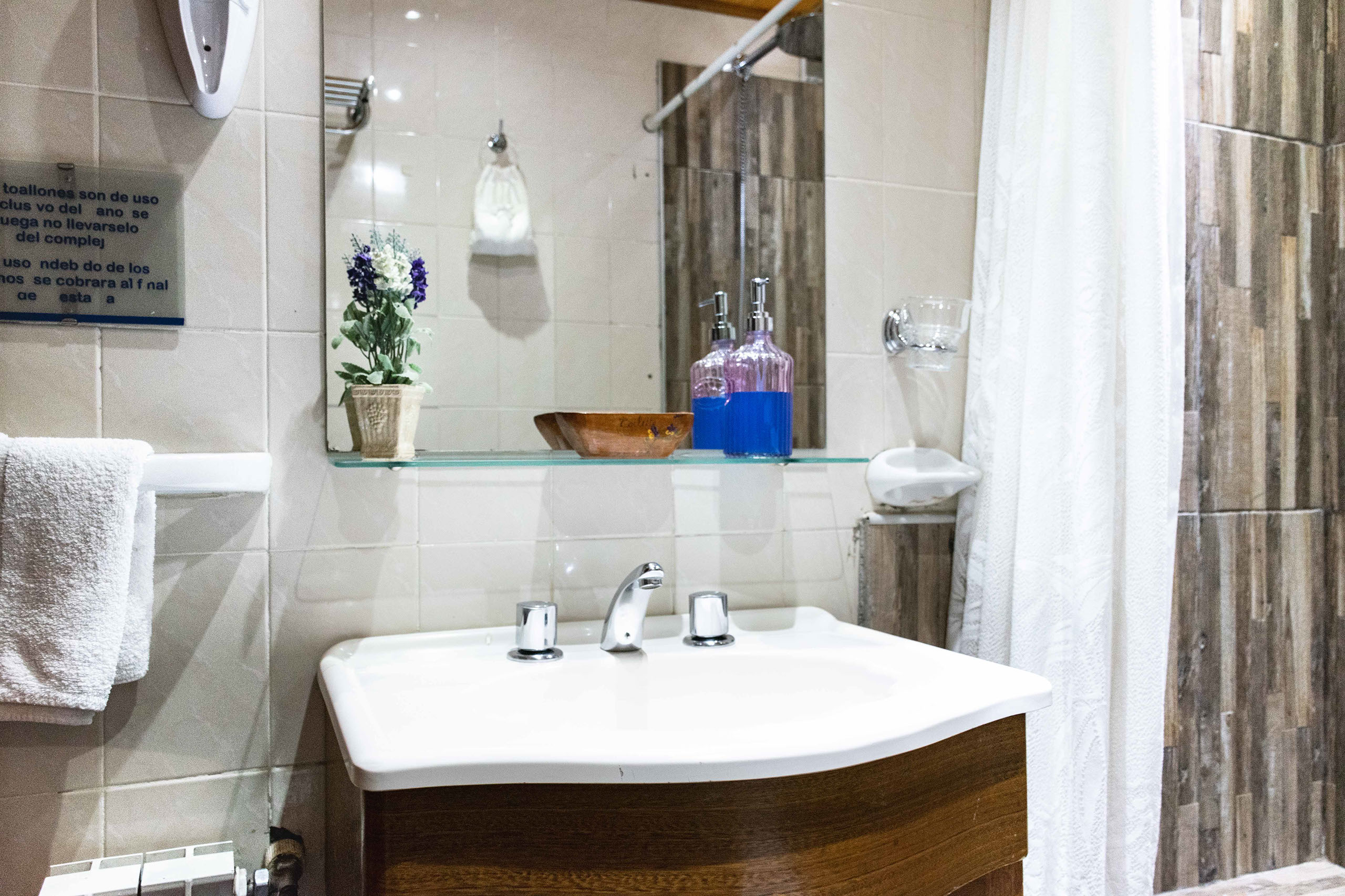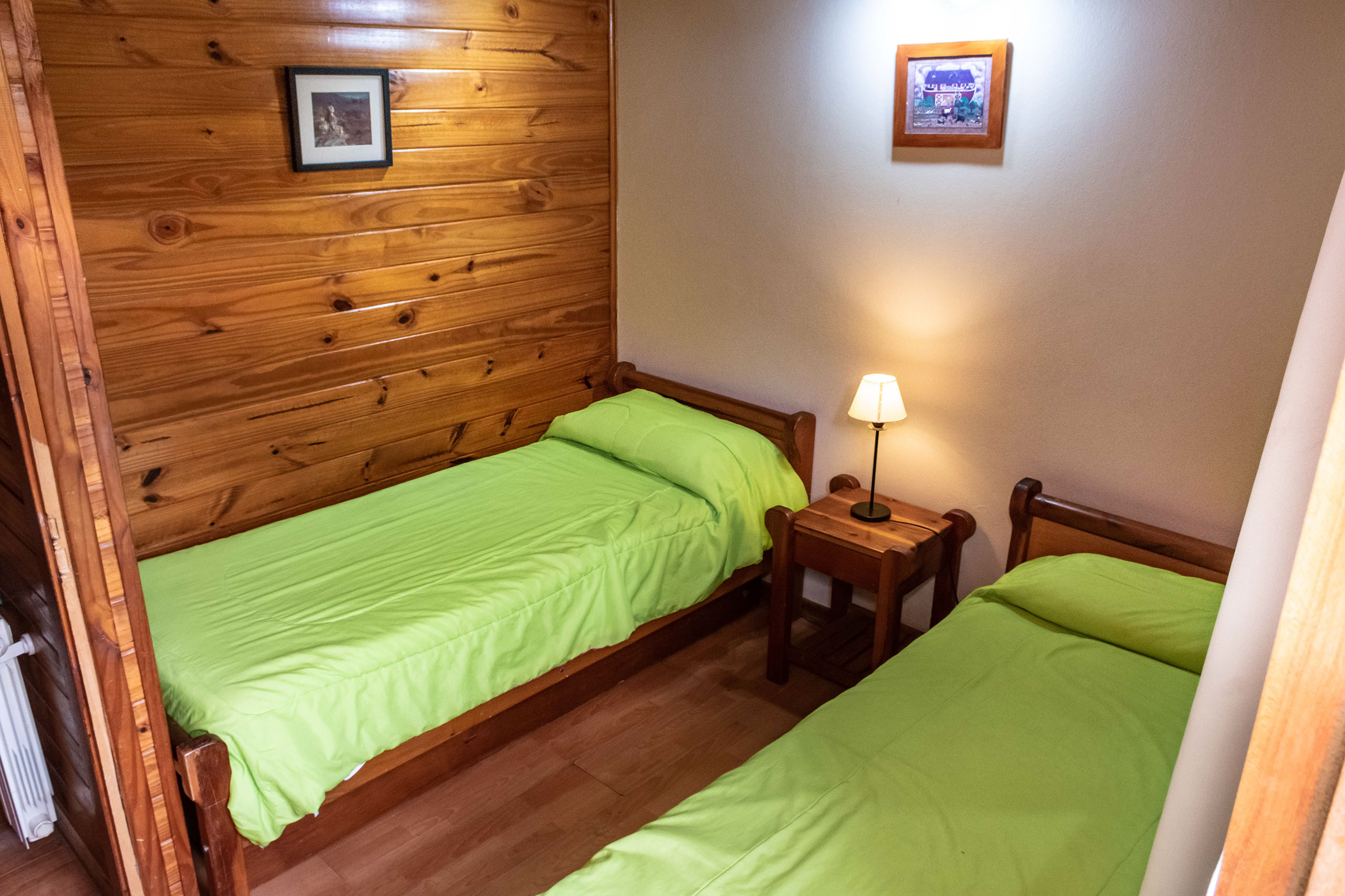 Todas nuestras cabañas poseen en planta baja un living que brinda un cálido ambiente para el relax, TV, teléfono, cocina comedor con todo el equipamiento y baño completo. En el primer piso, encontramos dos dormitorios, uno matrimonial (cama King) y otro con dos camas de una plaza, además de baño completo con bañera. En el caso de las cabañas mas grandes, hay un dormitorio muy amplio en segundo piso con camas simples.